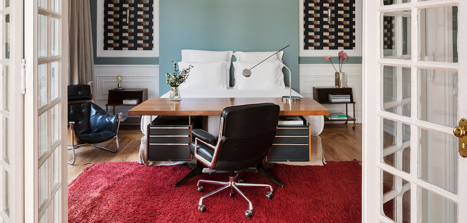When you can see the treasures of Lisbon laid out before you from your floor-to-ceiling windows, when your room encapsulates a vibrant world of its own, bathed in golden light and humming with possibilities that are echoed in every minute detail: from the bright song of the confident wallpapers – to the textured tiles of the huge bathrooms; from the deep tones of the bold paint that covers the walls to the luxurious Portuguese sheets that make up your generous bed. When you can curl up on an easy chair and look out over your very own sitting/work area whilst listening to the splash of water filling your sunken bath …what more could you want?